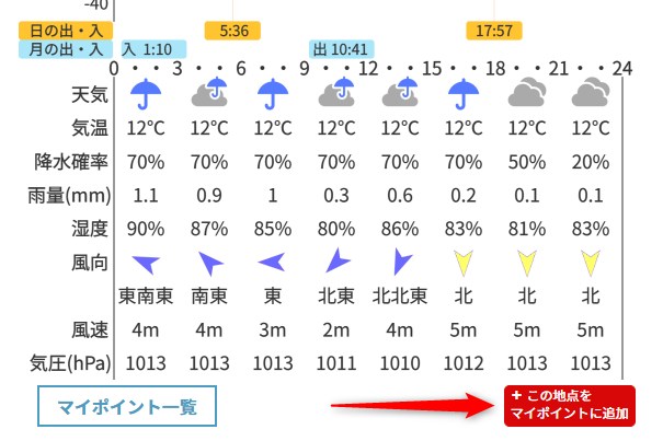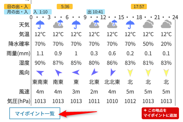天気予報エリアの右下の「この地点をマイポイントに追加」ボタンを押して登録画面を表示します。