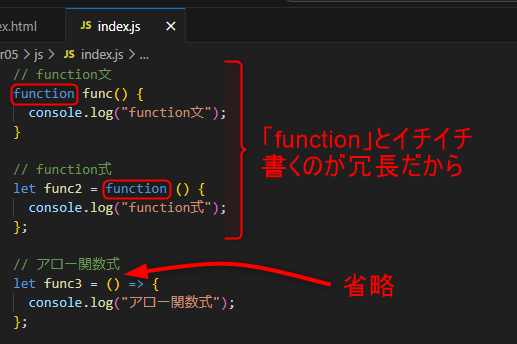 これからの時代、アロー関数式を使って関数を書くことを推奨しますが、3つの書き方を知っていないと他人が書いたJavaScriptコードが読めないので、順に全部解説していきます。