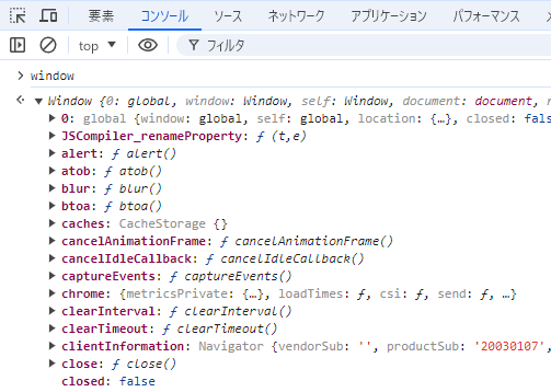逆に言えば、コンソールでwindowオブジェクトのメンバーを見ればJavaScriptのすべての機能を垣間見ることができます。