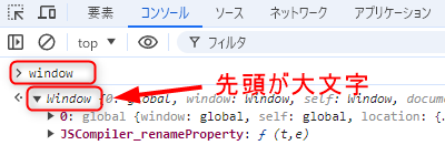 ブラウザで新しいタブを開いて、コンソールを表示して、全部小文字で「window」と入力してエンターキーを押し、その下に現れる▶をクリックして開きます。