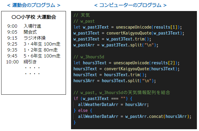 そもそも、プログラミングの「プログラム」とは、運動会のプログラムと同じ意味で、「進行表」の意味です。