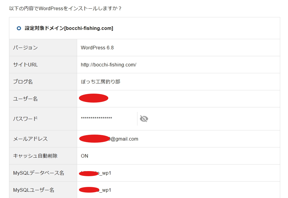 ブログ名や、WordPress管理画面にログインする時のユーザー名、パスワードと、WordPressに関する通知(コメントやアップデート完了など)を受け取るメールアドレスを入力します。