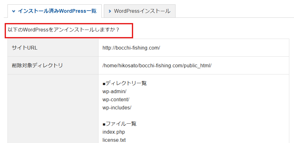 WordPressの削除もついでにやって、どうなるか確認してみました。