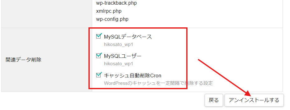 関連データ削除の3つの項目(MySQLデータベース、MySQLユーザー、キャッシュ自動削除Cron)にチェックを入れて、アンインストールするボタンをクリックします。